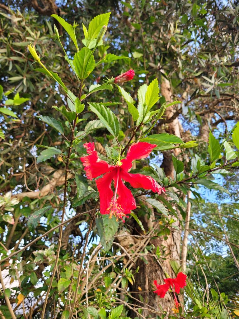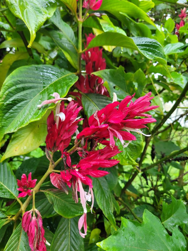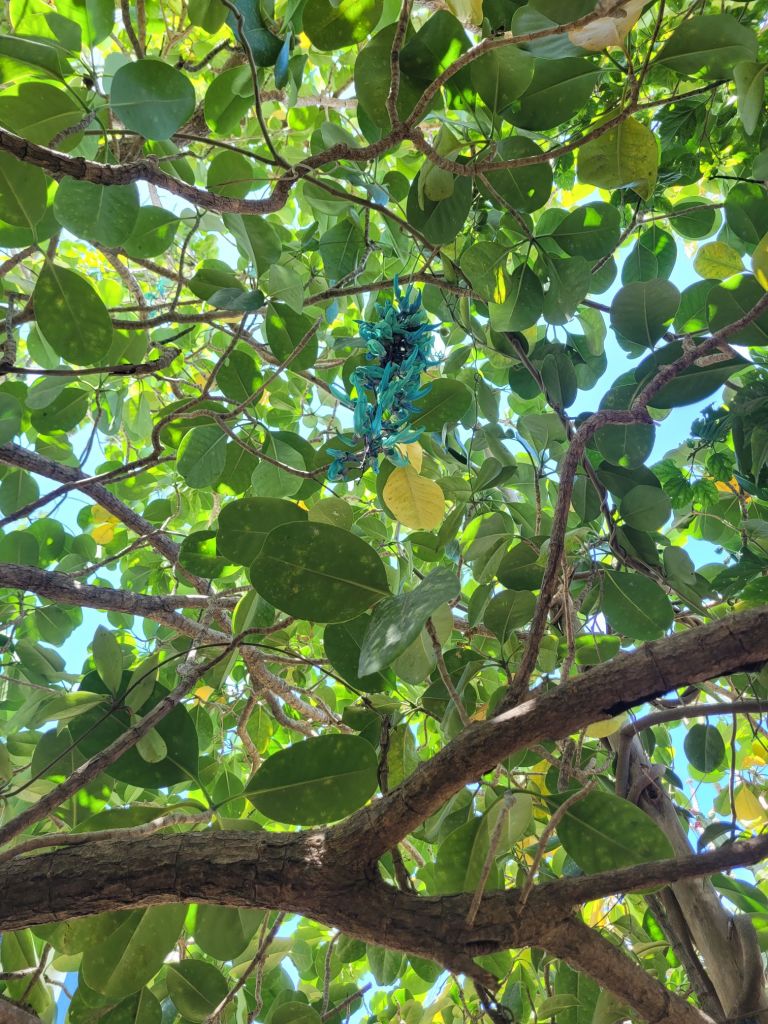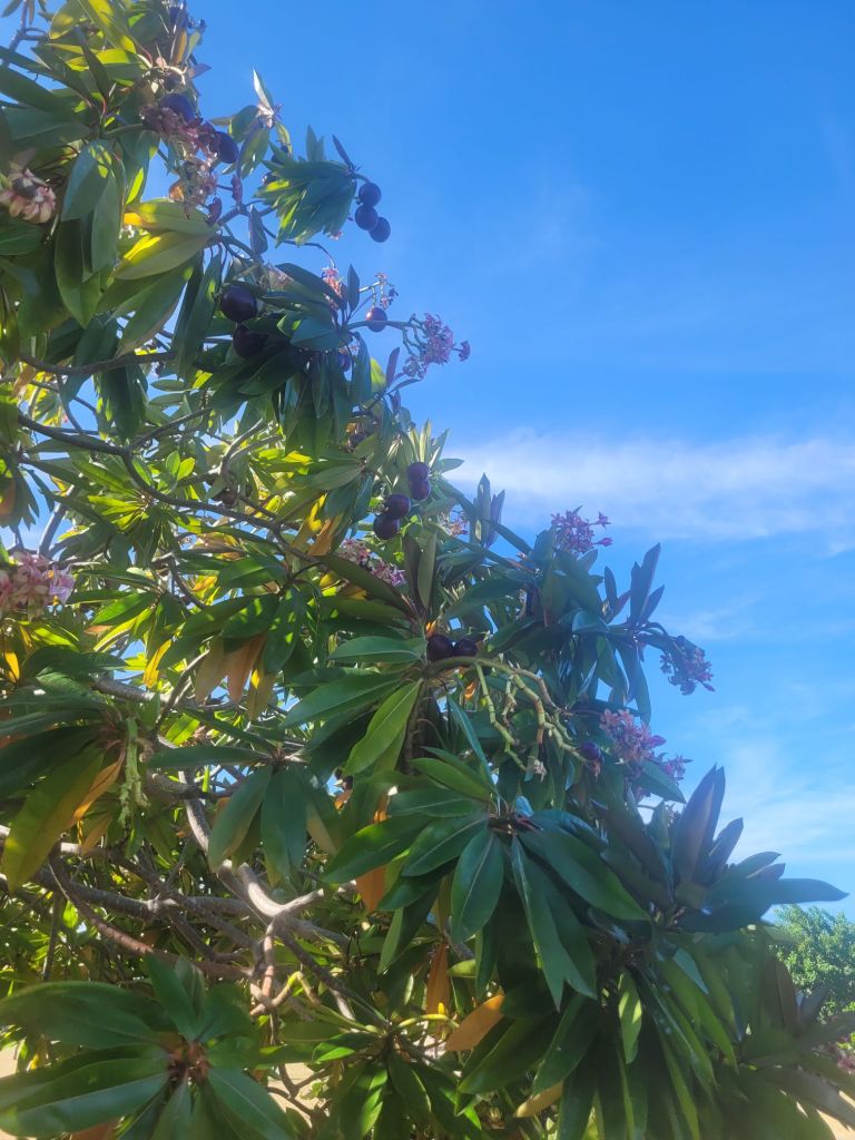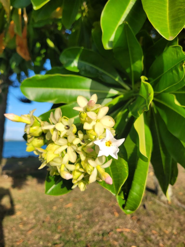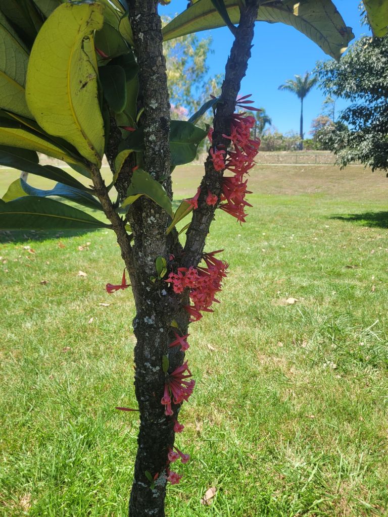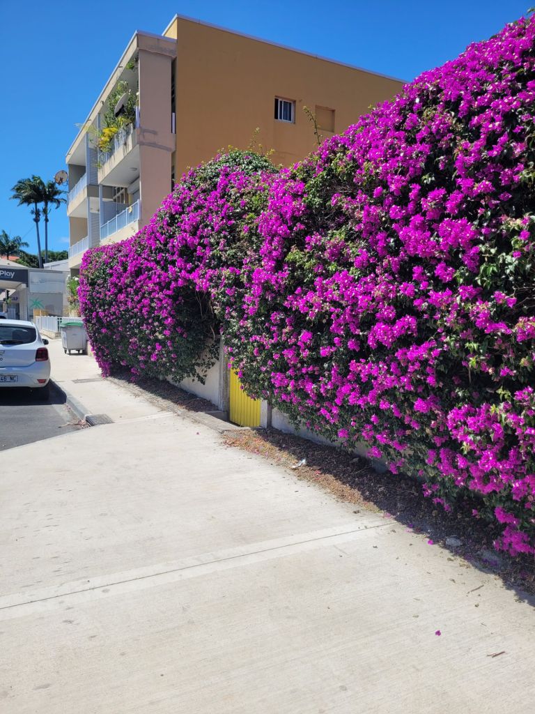 Bois pétrole. Sisi, c’est bien son nom. Les fleurs sentent très bon. Utilisé dans les îles du pacifique pour faire les couronnes ou guirlandes de fleurs.Hibiscus Lanterne Hamelia patens : Buisson aux colibrisBrumfelsia pauciflora a un nom vernaculaire très poétique : Hier, aujourd’hui, demain. Nom donné en raison du changement de couleur de ses fleurs avec le temps.Megaskepasma erythroclamys, seul espèce décrite du genre.Ficus habrophylla, faux figuier.Drynaria rigidula, fougère nid d’oiseaux. C’est une fougère qui peut poussé sur les arbres comme à terre. Les feuilles marrons servent de réceptacle pour la pluie et les feuilles qui finissent en humus et nourrissent ainsi la fougère.Un jour, sur une sortie de magasin, on voit des gens qui vendent des barquettes, ils nous disent que ce sont des framboises! Trop cool, on en prend une barquette. Alors oui, mais non, ce sont des fruits du framboisiers d’Asie, Rubus rosifolius pour les intimes. Les fruits ressemblent aux bonbons avec pleins de petites billes de sucre rouge ou noir. Mais clairement, ça n’a aucun goût. Faustine a bien aimé quand même !Passiflora miniata : passiflore écarlate Euphorbia tithymaloides, c’est une succulente.Allamanda blanchetii, (pourpre), il existe aussi en jaune (Allamanda cathartica)Bohenia monandra : Arbre orchidéeTabébuia rose, floraison magnifique mais éphémère.Encore une plante grimpante : l’étoile d’Australie Mansoa alliacea : Liane d’ailTabebuia aura ou arbre trompette des caraïbes. ( c’est Jo qui fait de la trompette à dit Faustine)Cerbera mangas : Faux manguier, un de ses nom vernaculaire est « L’arbre à suicide » car les fruits, les graines et le latex sont toxiques et mortels. Il est encore utilisé en Inde pour se suicider. Dans le culture kanak, cette arbre représente un lien entre le monde des vivants et celui des morts.Fleurs du Faux manguier, elles sentent très bon! Dommage qu’il soit aussi toxiqueLiane de jade (fleur) magnifique grimpante que l’on peut voir en plusieurs couleurs. La floraison est de toute beauté. FlamboyantGroupe de flamboyants derrière Colin et Faustine Ixora margaretae: endémique de Nouvelle-Calédonie. C est un arbre cauliflore (les fleurs poussent sur le tronc).Terminalia cherrieri, endémique, très méllifère, souvent couvert d’abeilles et de papillons.Jacaranda ( mon préféré ici, pour l’instant) feuillage très léger et fleur d’un violet magnifique presque bleu)Bougainvillier (Mamie serait en pamoison ici) celui-ci aux feuilles panachées est magnifique Haie de Bougainvillier. Il y en a partout, de toutes les couleurs de toutes les formes et de toute les tailles. C’est beau !!Thunbergia mysorensis : Liane de Mysore.