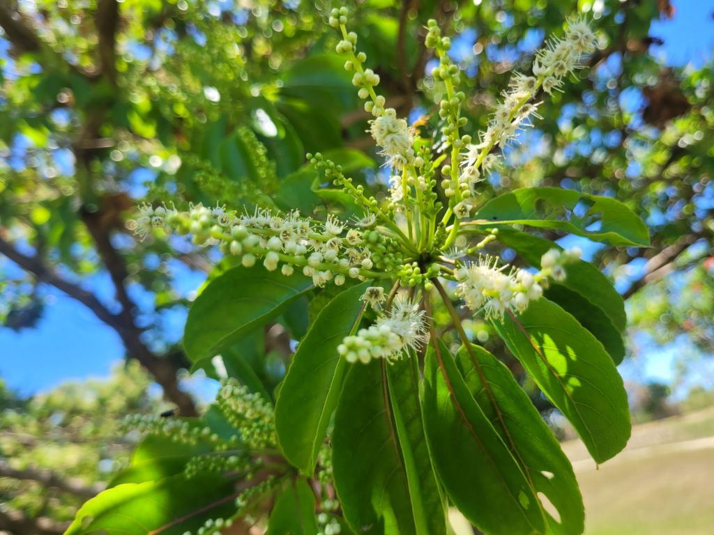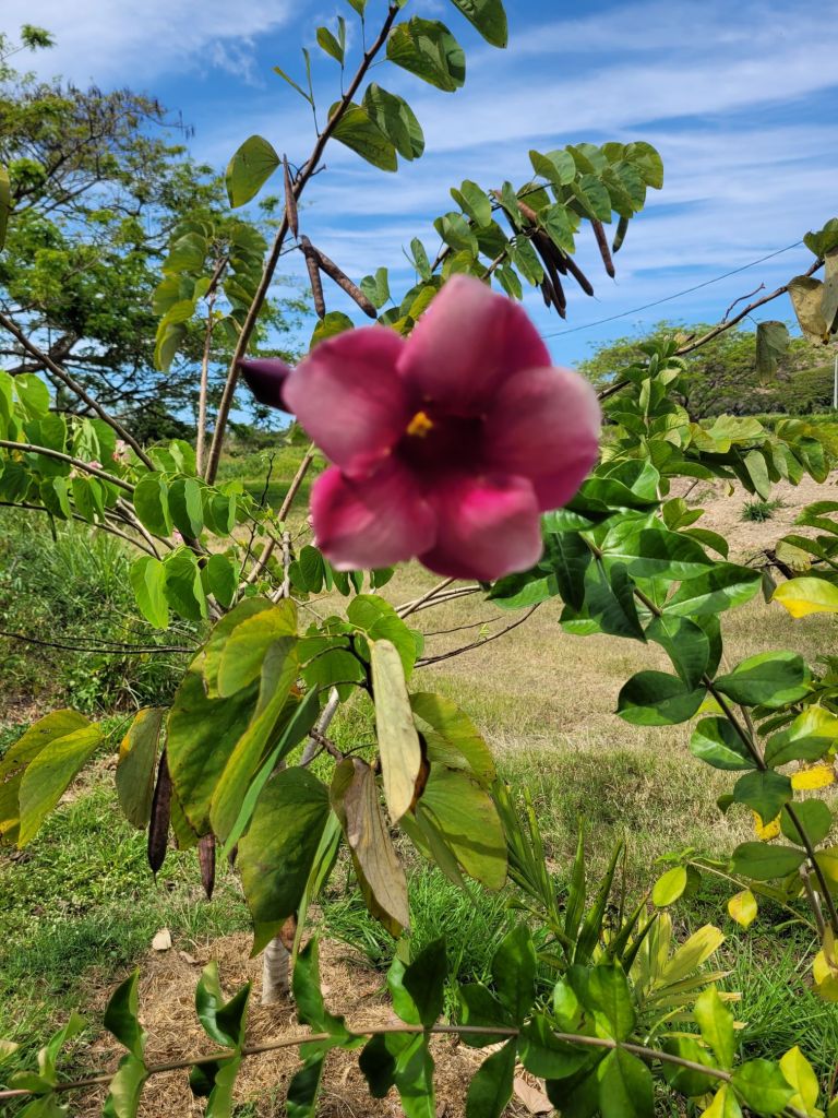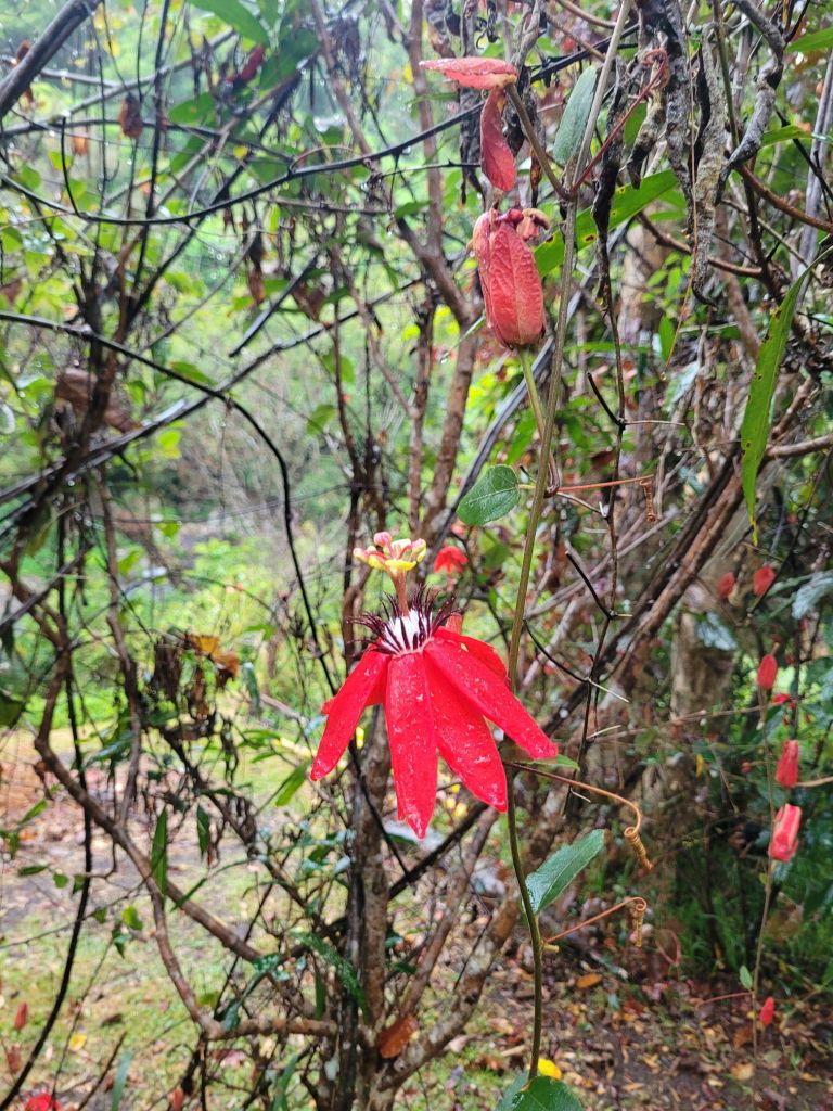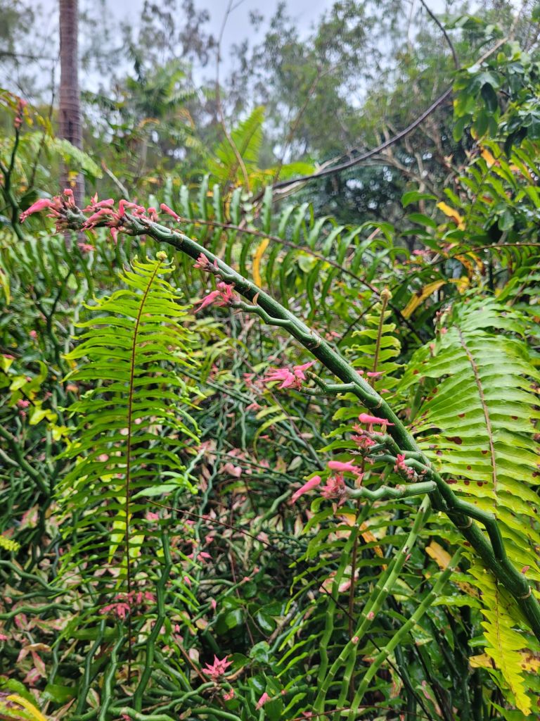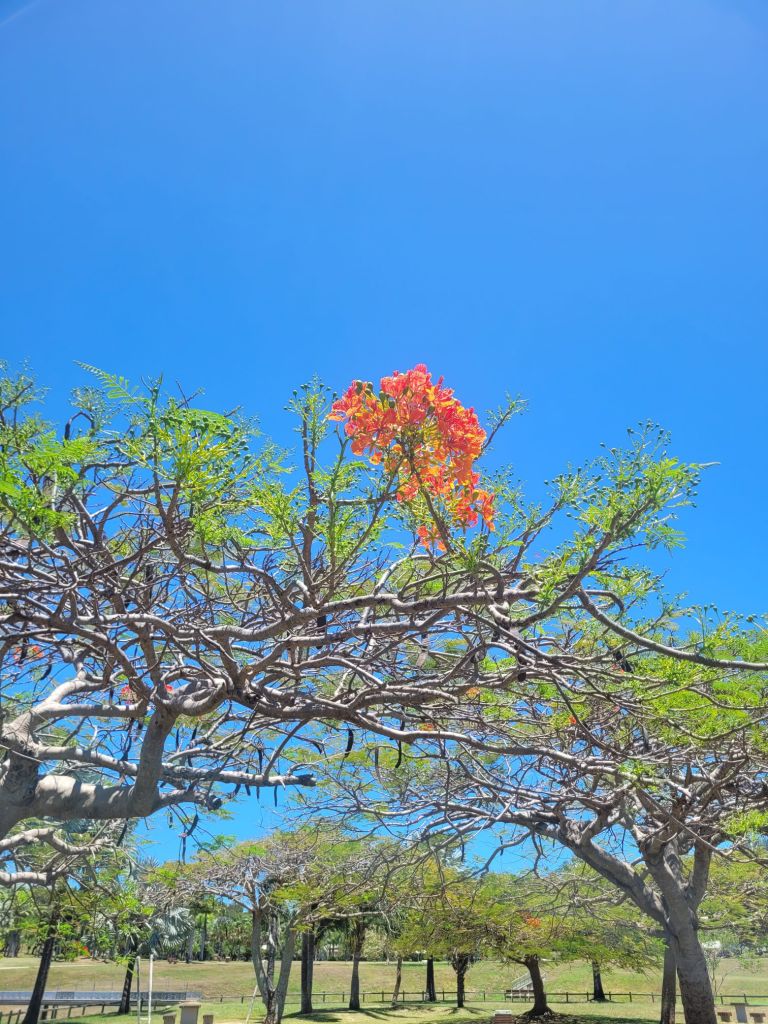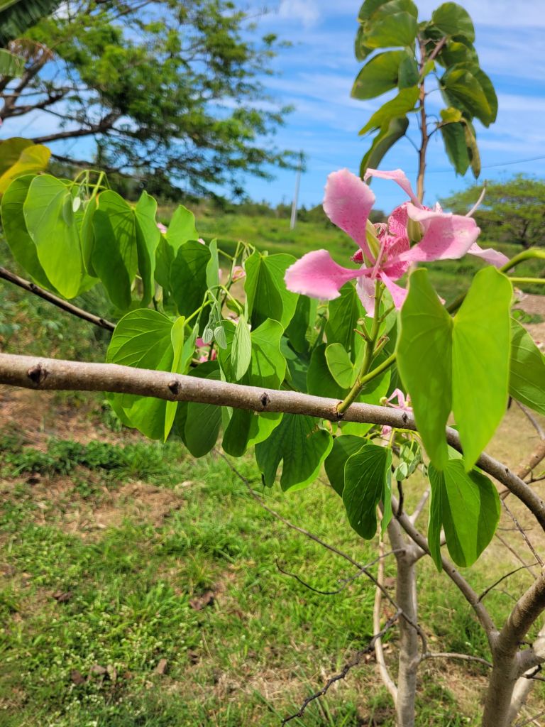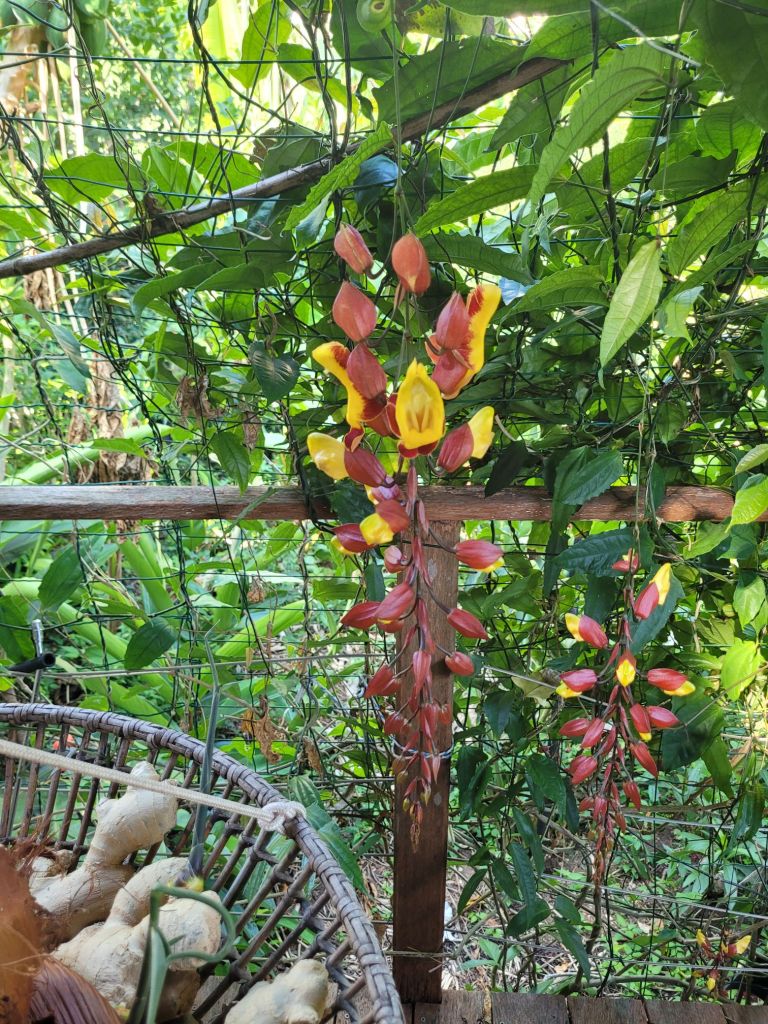 Bois pétrole. Sisi, c’est bien son nom. Les fleurs sentent très bon. Utilisé dans les îles du pacifique pour faire les couronnes ou guirlandes de fleurs.Hibiscus Lanterne Hamelia patens : Buisson aux colibrisBrumfelsia pauciflora a un nom vernaculaire très poétique : Hier, aujourd’hui, demain. Nom donné en raison du changement de couleur de ses fleurs avec le temps.Megaskepasma erythroclamys, seul espèce décrite du genre.Ficus habrophylla, faux figuier.Drynaria rigidula, fougère nid d’oiseaux. C’est une fougère qui peut poussé sur les arbres comme à terre. Les feuilles marrons servent de réceptacle pour la pluie et les feuilles qui finissent en humus et nourrissent ainsi la fougère.Un jour, sur une sortie de magasin, on voit des gens qui vendent des barquettes, ils nous disent que ce sont des framboises! Trop cool, on en prend une barquette. Alors oui, mais non, ce sont des fruits du framboisiers d’Asie, Rubus rosifolius pour les intimes. Les fruits ressemblent aux bonbons avec pleins de petites billes de sucre rouge ou noir. Mais clairement, ça n’a aucun goût. Faustine a bien aimé quand même !Passiflora miniata : passiflore écarlate Euphorbia tithymaloides, c’est une succulente.Allamanda blanchetii, (pourpre), il existe aussi en jaune (Allamanda cathartica)Bohenia monandra : Arbre orchidéeTabébuia rose, floraison magnifique mais éphémère.Encore une plante grimpante : l’étoile d’Australie Mansoa alliacea : Liane d’ailTabebuia aura ou arbre trompette des caraïbes. ( c’est Jo qui fait de la trompette à dit Faustine)Cerbera mangas : Faux manguier, un de ses nom vernaculaire est « L’arbre à suicide » car les fruits, les graines et le latex sont toxiques et mortels. Il est encore utilisé en Inde pour se suicider. Dans le culture kanak, cette arbre représente un lien entre le monde des vivants et celui des morts.Fleurs du Faux manguier, elles sentent très bon! Dommage qu’il soit aussi toxiqueLiane de jade (fleur) magnifique grimpante que l’on peut voir en plusieurs couleurs. La floraison est de toute beauté. FlamboyantGroupe de flamboyants derrière Colin et Faustine Ixora margaretae: endémique de Nouvelle-Calédonie. C est un arbre cauliflore (les fleurs poussent sur le tronc).Terminalia cherrieri, endémique, très méllifère, souvent couvert d’abeilles et de papillons.Jacaranda ( mon préféré ici, pour l’instant) feuillage très léger et fleur d’un violet magnifique presque bleu)Bougainvillier (Mamie serait en pamoison ici) celui-ci aux feuilles panachées est magnifique Haie de Bougainvillier. Il y en a partout, de toutes les couleurs de toutes les formes et de toute les tailles. C’est beau !!Thunbergia mysorensis : Liane de Mysore.