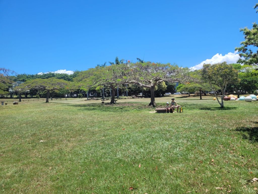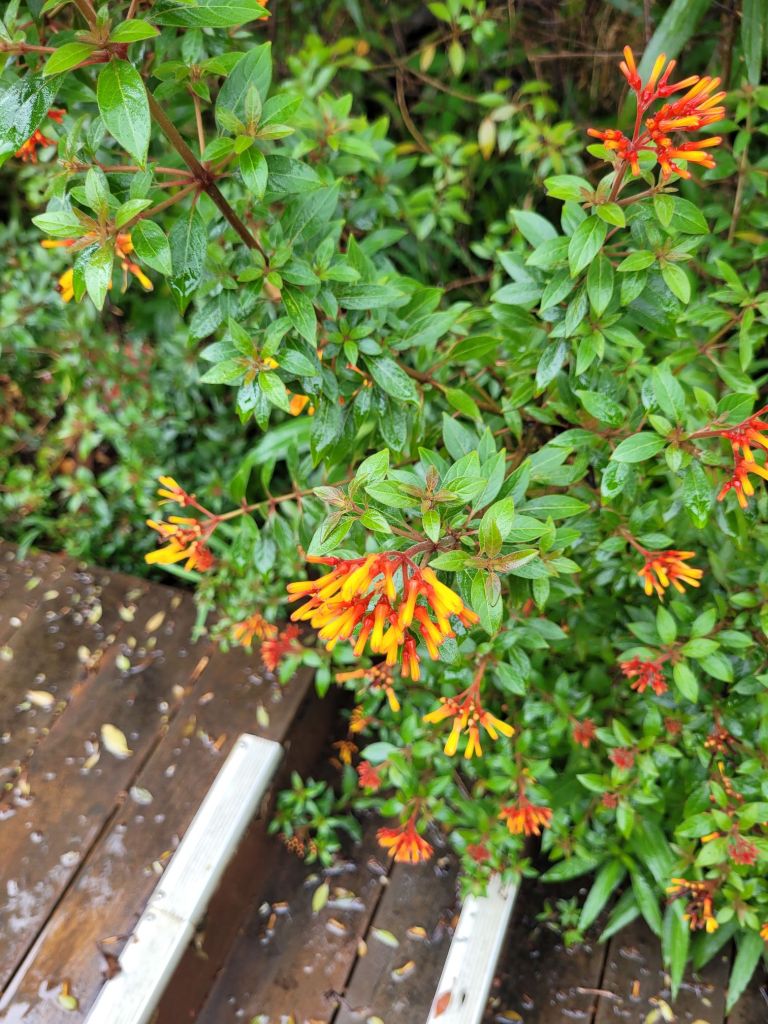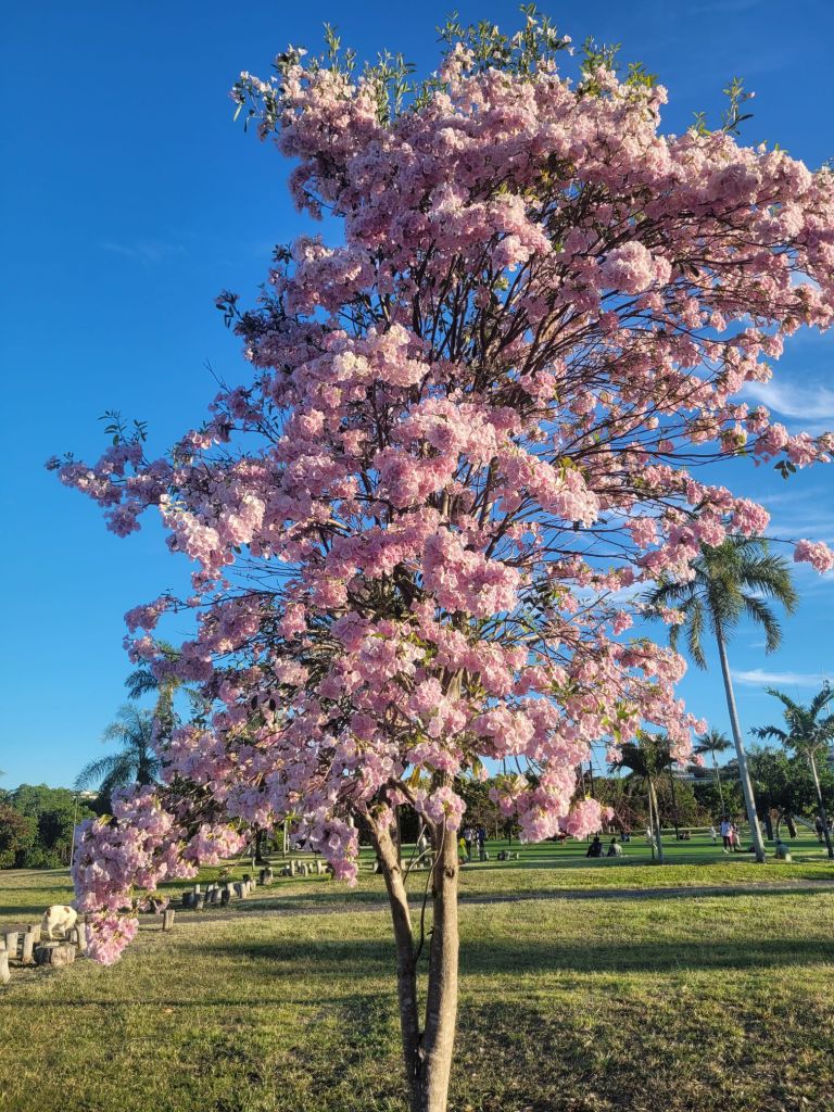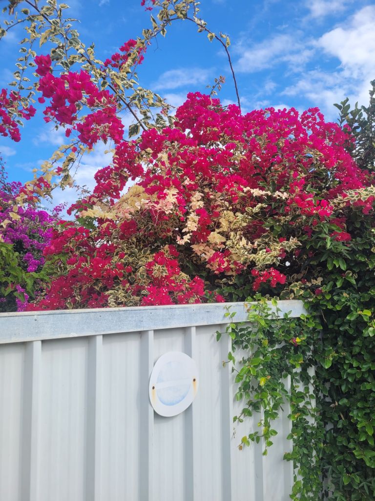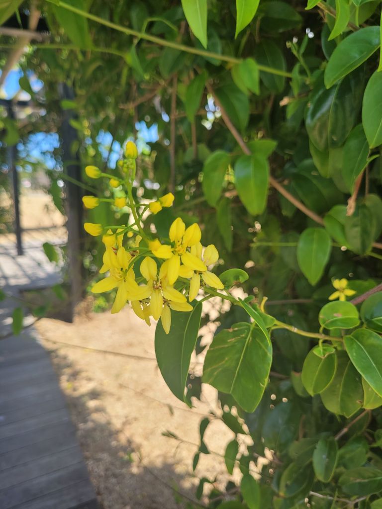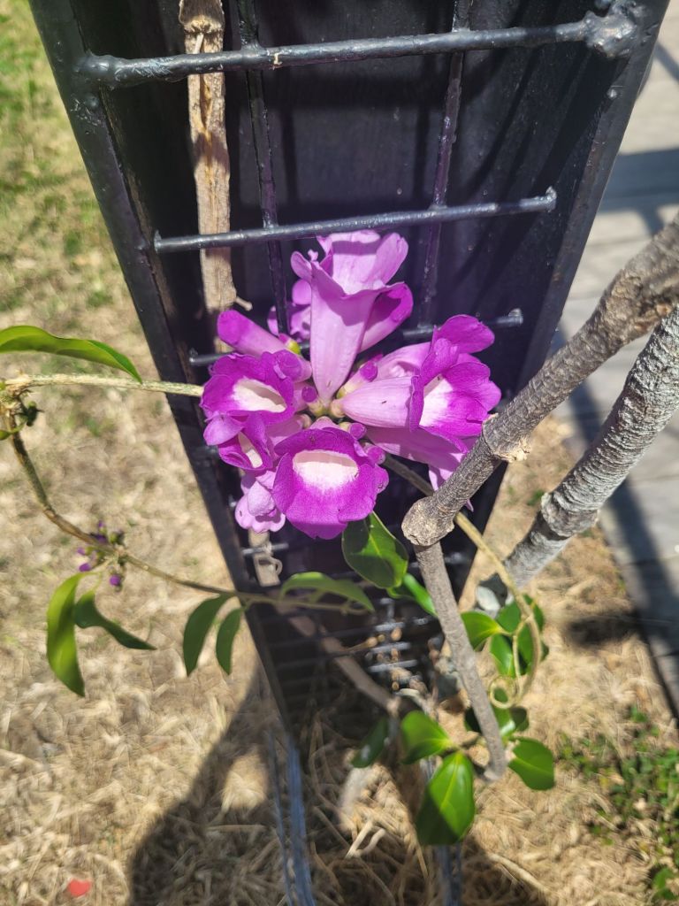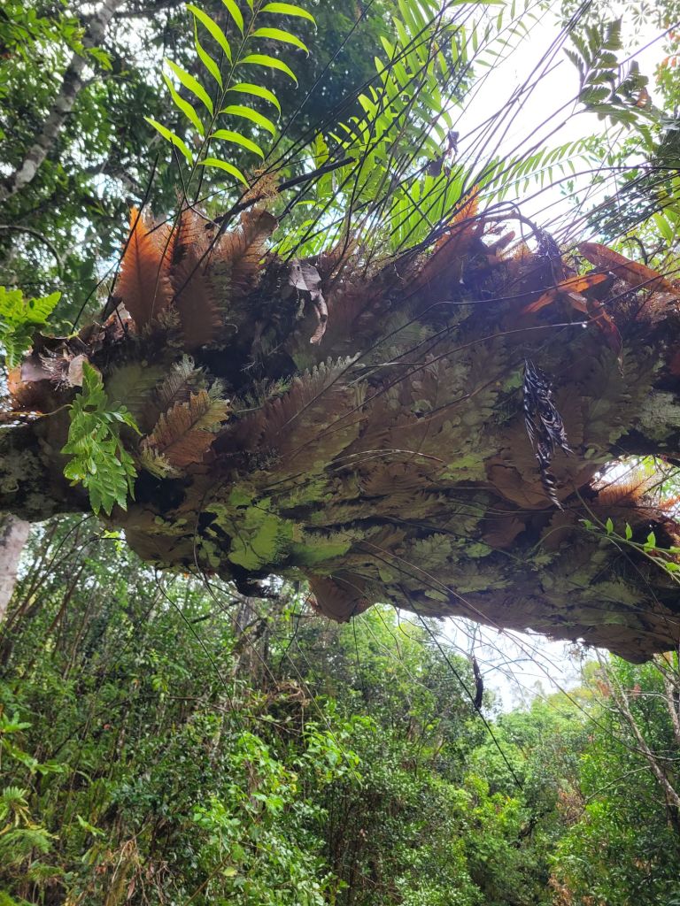 Bois pétrole. Sisi, c’est bien son nom. Les fleurs sentent très bon. Utilisé dans les îles du pacifique pour faire les couronnes ou guirlandes de fleurs.Hibiscus Lanterne Hamelia patens : Buisson aux colibrisBrumfelsia pauciflora a un nom vernaculaire très poétique : Hier, aujourd’hui, demain. Nom donné en raison du changement de couleur de ses fleurs avec le temps.Megaskepasma erythroclamys, seul espèce décrite du genre.Ficus habrophylla, faux figuier.Drynaria rigidula, fougère nid d’oiseaux. C’est une fougère qui peut poussé sur les arbres comme à terre. Les feuilles marrons servent de réceptacle pour la pluie et les feuilles qui finissent en humus et nourrissent ainsi la fougère.Un jour, sur une sortie de magasin, on voit des gens qui vendent des barquettes, ils nous disent que ce sont des framboises! Trop cool, on en prend une barquette. Alors oui, mais non, ce sont des fruits du framboisiers d’Asie, Rubus rosifolius pour les intimes. Les fruits ressemblent aux bonbons avec pleins de petites billes de sucre rouge ou noir. Mais clairement, ça n’a aucun goût. Faustine a bien aimé quand même !Passiflora miniata : passiflore écarlate Euphorbia tithymaloides, c’est une succulente.Allamanda blanchetii, (pourpre), il existe aussi en jaune (Allamanda cathartica)Bohenia monandra : Arbre orchidéeTabébuia rose, floraison magnifique mais éphémère.Encore une plante grimpante : l’étoile d’Australie Mansoa alliacea : Liane d’ailTabebuia aura ou arbre trompette des caraïbes. ( c’est Jo qui fait de la trompette à dit Faustine)Cerbera mangas : Faux manguier, un de ses nom vernaculaire est « L’arbre à suicide » car les fruits, les graines et le latex sont toxiques et mortels. Il est encore utilisé en Inde pour se suicider. Dans le culture kanak, cette arbre représente un lien entre le monde des vivants et celui des morts.Fleurs du Faux manguier, elles sentent très bon! Dommage qu’il soit aussi toxiqueLiane de jade (fleur) magnifique grimpante que l’on peut voir en plusieurs couleurs. La floraison est de toute beauté. FlamboyantGroupe de flamboyants derrière Colin et Faustine Ixora margaretae: endémique de Nouvelle-Calédonie. C est un arbre cauliflore (les fleurs poussent sur le tronc).Terminalia cherrieri, endémique, très méllifère, souvent couvert d’abeilles et de papillons.Jacaranda ( mon préféré ici, pour l’instant) feuillage très léger et fleur d’un violet magnifique presque bleu)Bougainvillier (Mamie serait en pamoison ici) celui-ci aux feuilles panachées est magnifique Haie de Bougainvillier. Il y en a partout, de toutes les couleurs de toutes les formes et de toute les tailles. C’est beau !!Thunbergia mysorensis : Liane de Mysore.