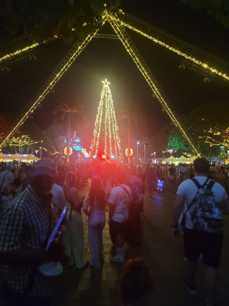 Nous la sentions arriver et malgré la douceur du climat, nous n’ y avons pas échappé… Mais quoi donc?? La déferlante de décorations, figurines géantes, illuminations qui annoncent les fêtes de fin d’années, pardi ! Avant même qu’Halloween ne soit passé, les magasins étaient déjà décorés d’une multitude de Pères Noël géants, de guirlandes multicolores et de sapins synthétiques… Mais malgré tout ça, et les multiples plans fanfare de Noël, il reste difficile de se mettre dans l’ambiance sous les tropiques ! Petit aperçu d’à quoi ressemblent les fêtes ici: