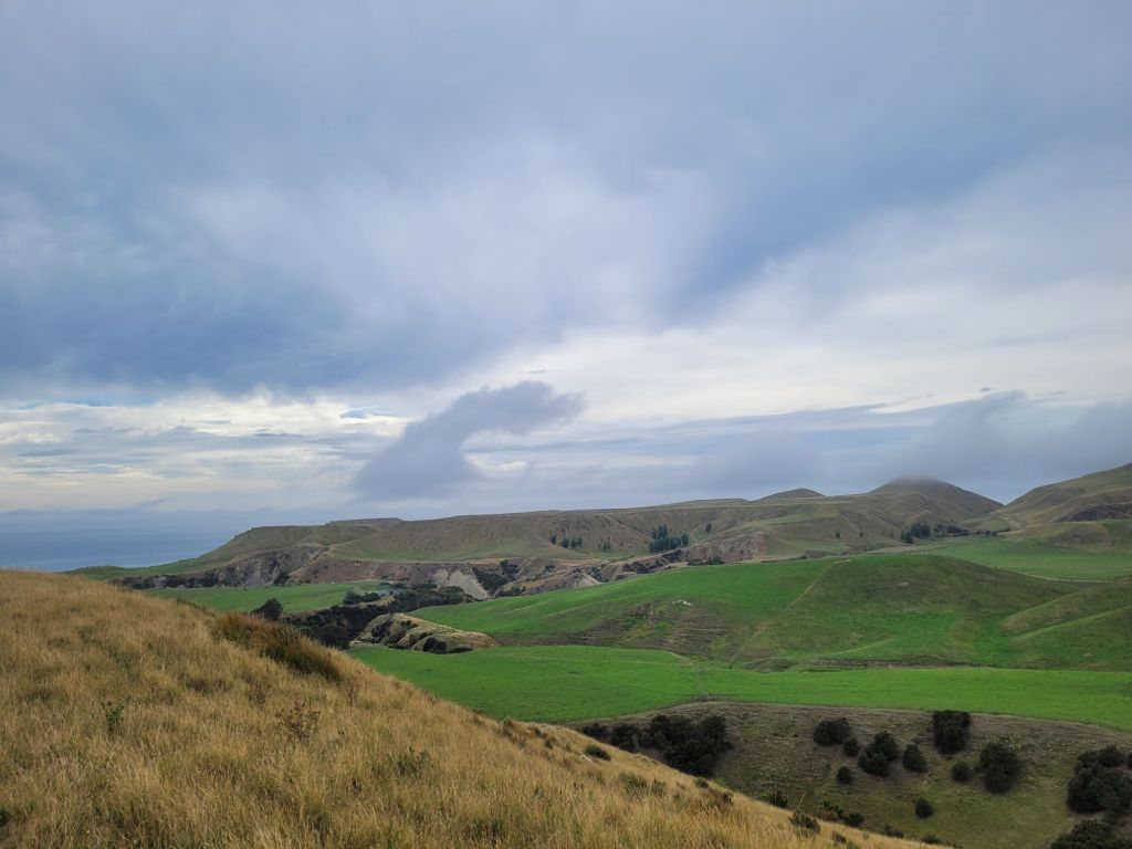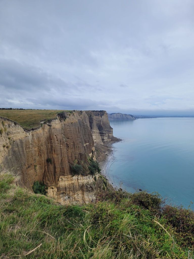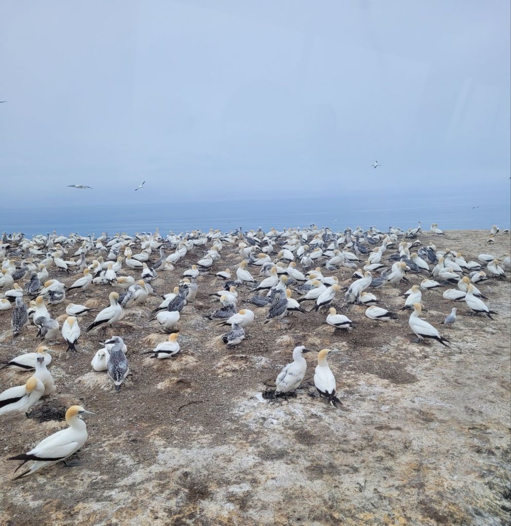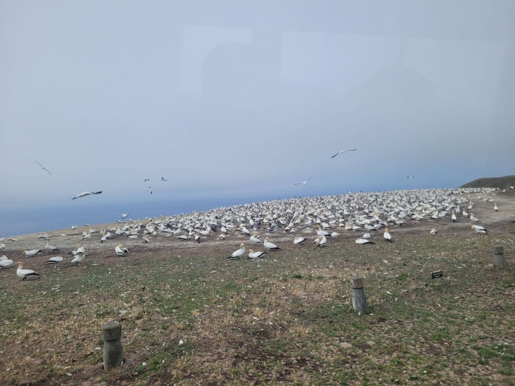 Super accueil dans notre logement de Napier, on a eu droit à une visite de sa petite ferme (poules et moutons) ainsi que la transmission de plein d’infos sur l’histoire de la région (tremblement de terre en 1931, cyclone Gabriella en 2023…) C’est une région qui a été façonnée par les événements climatiques.C’est un super endroit entouré d’un jardin un peu punk très sympa.Petit tour à la Mission Estate Winery, plus ancien domaine viticole de Nouvelle-Zélande fondé par des missionnaires français en 1851.Avec dégustation de vin rouge (Pinot noir, Syrah, Malbec, Cabernet-Sauvignon) et repas au restaurant.Visite de Napier. La ville a subi un important tremblement de terre en 1931. Elle a été presque entièrement reconstruite dans le style de l’époque : Art déco.Art déco aux couleurs Maories, s’il vous plaît.Sculpture » A wave in time » avec un chien qui a beaucoup plu à Faustine. La ville est pleine de bâtiments dans ce style.Le lendemain, c’est parti pour le Gannet Safari ! Notre chauffeur a un accent à couper au couteau et on ne comprend vraiment pas tout, mais les paysages sont superbes !Les paysages sont magnifiques malgré un ciel maussade.On est arrivés! Au loin un colonie de fous de bassan, il y en a 4 en tout au Cap Kidnappers pour plusieurs milliers d’oiseaux.La plus impressionnante est celle à nos pieds…Les mâles et les femelles ne se distingue pas mais on reconnaît bien les juvéniles.