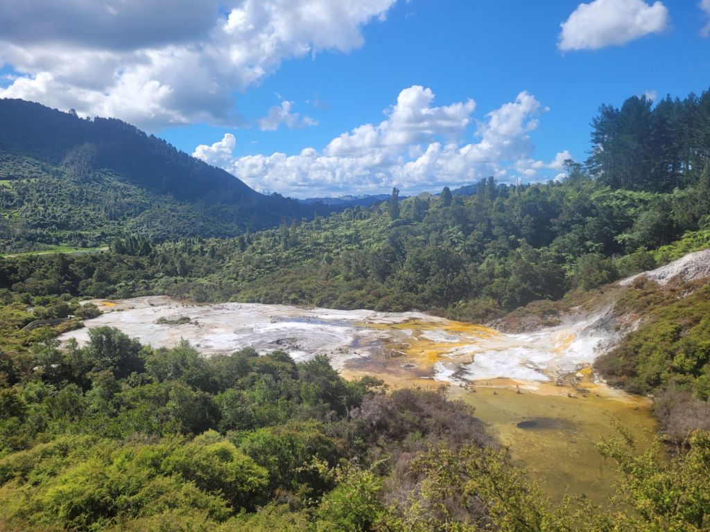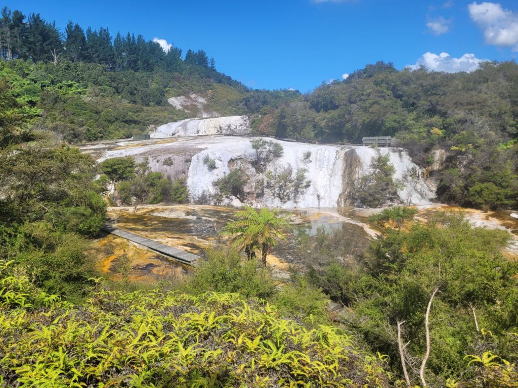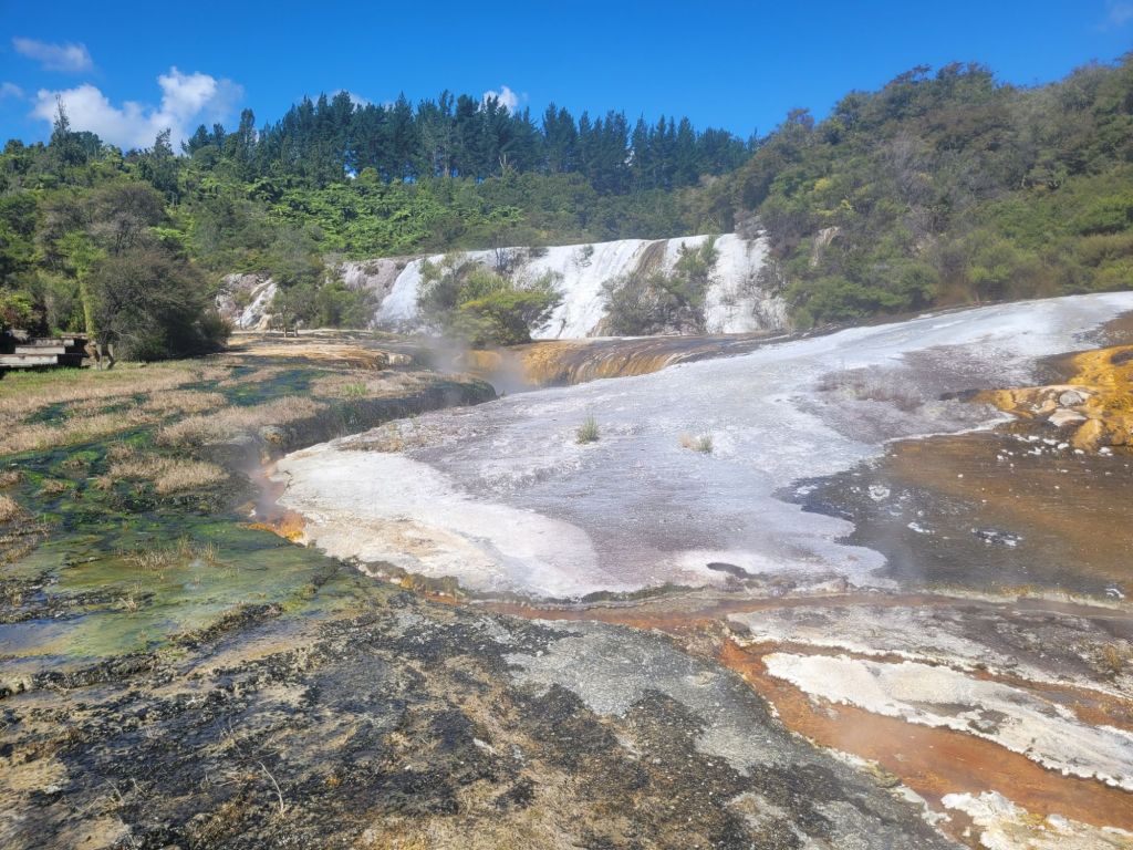Au revoir Napier, tes vergers, tes plages noires et tes collines pleine de moutons… on aurait bien profité un peu plus mais la pluie en a décidé autrement !Le lendemain, sur le trajet de notre nouveau logement, on s’arrête au Orakei Korako geothermal Park and Cave. Ce parc géothermal a l’air de sortir de nulle part, il faut traverser une rivière en bateau pour y accéder.Des sources d’eaux souffrées entourées de forêt verdoyante.