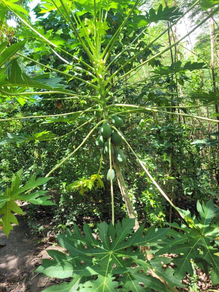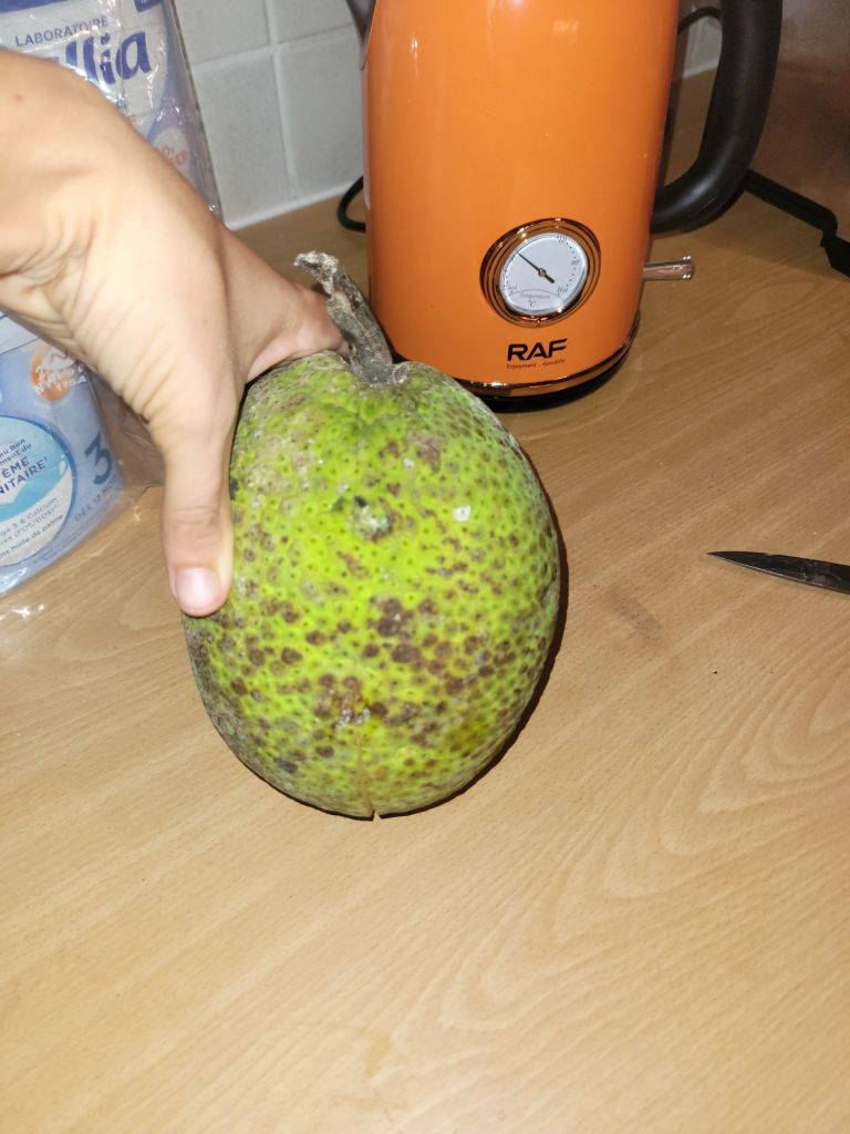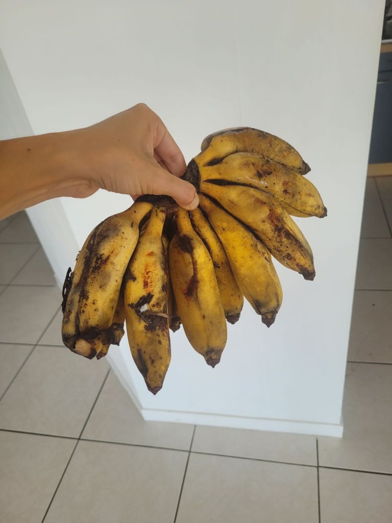 La Papaye : c’est sûrement le fruit qu’on mange le plus depuis notre arrivée… et depuis qu’on a découvert que c’était excellent en fait!! Ici, il y a des papayers partout, semés volontairement ou dispersés par les oiseaux. Les meilleures seraient les papayes dites « rouges ». La papaye se mange aussi verte, en salade salée… mais c’est moins bon!Les papayers sont des plantes dioïques, c’est à dire qu’il y a des pieds mâles et femelles. Logiquement, c’est le pied femelle qui porte les fruits, qui poussent directement sur le tronc. Le pied mâle a des fleurs au bout de longues tiges et ne sert qu’à… polliniser. Et encore, certains pieds femelles peuvent être en parti bisexués et s’auto-feconder.Les bananes figues et les bananes pommes, plus fermes, plus sucrées, un peu d’acidité… fini les bananes cavendishs pas mûres de métropole. Celles-là sont excellentes !!!La pomme-cannelle (attier), fruit de la taille d’une pomme, à la chair blanche et douce avec plein de pépins noirs et lisses. De la famille des annonacées, donc à ne pas consommer trop souvent. L’annonacine présente dans les fruits de cette famille aurait un lien avec l’apparition de la maladie de Parkinson mais ce serait aussi une très bonne molécule antitumorale, antivirale, antipaludéenne, antimicrobienne… un fruit qui illustre bien le principe du « pharmakon ».Le Corossol! Ahlala, que dire… On adoooooore le corossol!! C’est un fruit qui a un goût de bonbon arlequin! Mais comme sa cousine la pomme-cannelle, c’est un fruit de la famille des annonacés, donc à manger avec parcimonie!Vous le connaissez sûrement! Ici, il s’appelle pomme-liane, il y en a des gros jaunes, des petits rouges, des moyens verts… c’est le fruit de la passiflore, autrement dit le fruit de la passion! Ici, il est plus sucré ou plus acide… surtout il y a plein de variétés !! Pour un bon coup de fouet sucré au petit déjeuner ou autre. Faustine dit : »Je veux de la passion!! »L’abiu (à prononcer Abiou) ou poutérier de Guyane, petit fruit originaire des forêts tropicales d’Amérique du Sud. Le terme désigne le fruit et l’arbre. La chair est douce et sucrée, et le fruit se mange comme un kiwi. Attention aux gros pépins tout de même !Le pitaya ou fruit du dragon : c’est la pleine saison en ce moment. C’est le fruit d’un cactus qui pousse partout et dont les fleurs sont magnifiques. La chair peut être blanche ou rose fuschia. Ça n’a pas énormément de goût mais c’est très désaltérant!La fleur du pitaya!Le fruit à pain: le fruit avec lequel on peut tout faire, du salé, du sucré et…du pain! Nous l,avons préféré rôti au four. Il se mange aussi cru comme un fruit quand il est très mur. Il a une saveur sucrée acidulée et farineuse car plein d’amidon.L intérieur du fruit à pain.