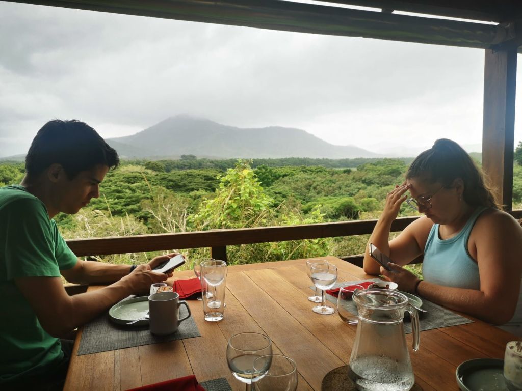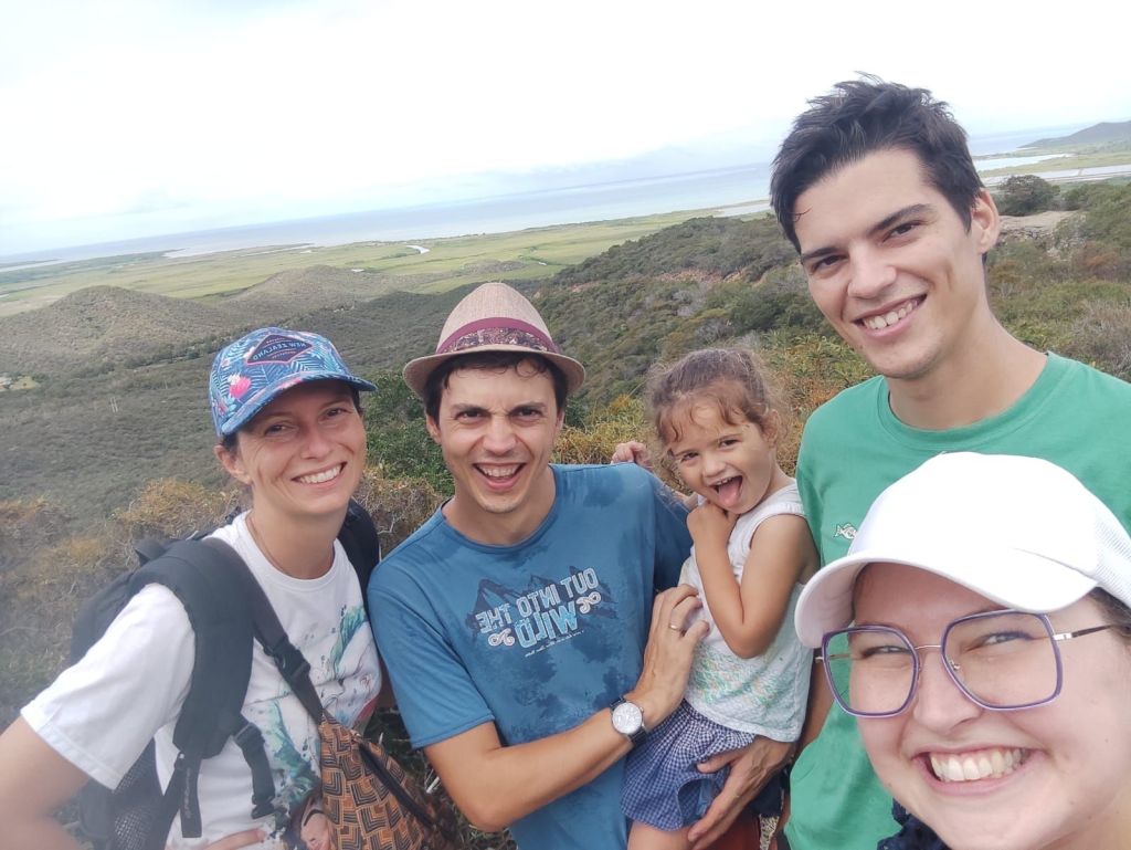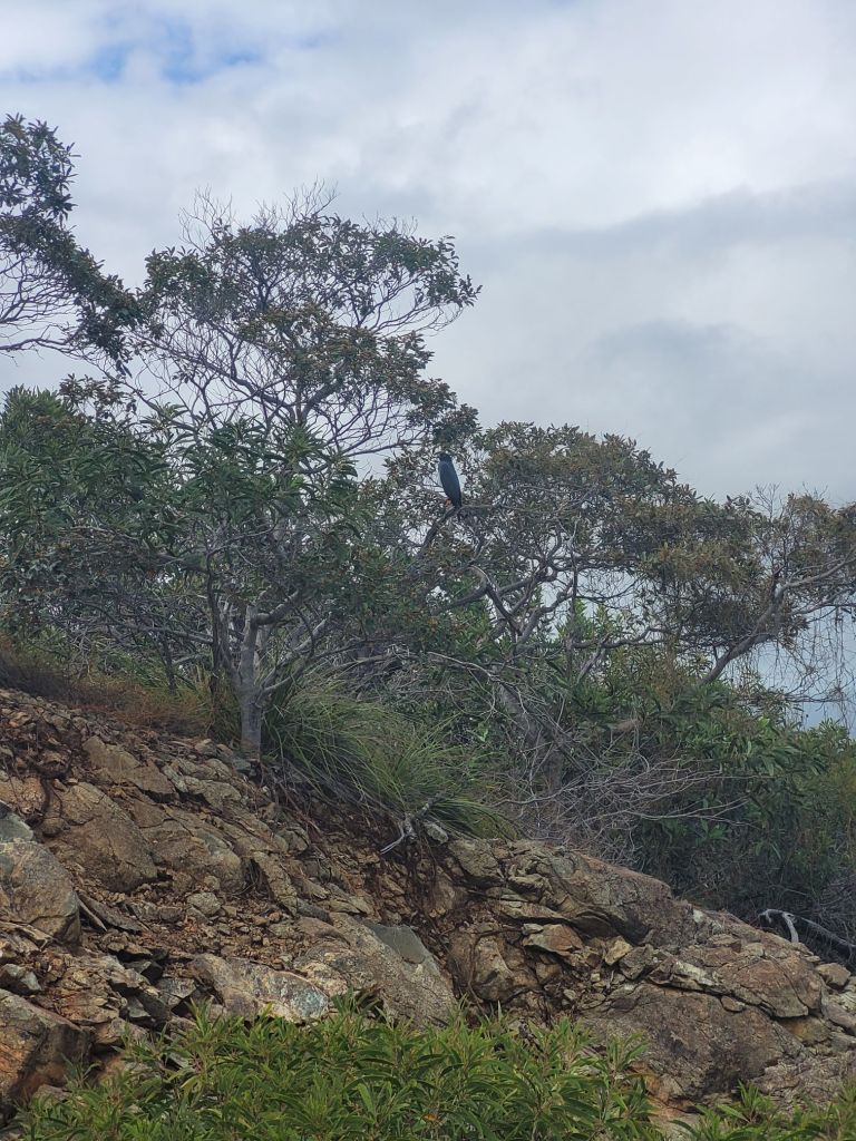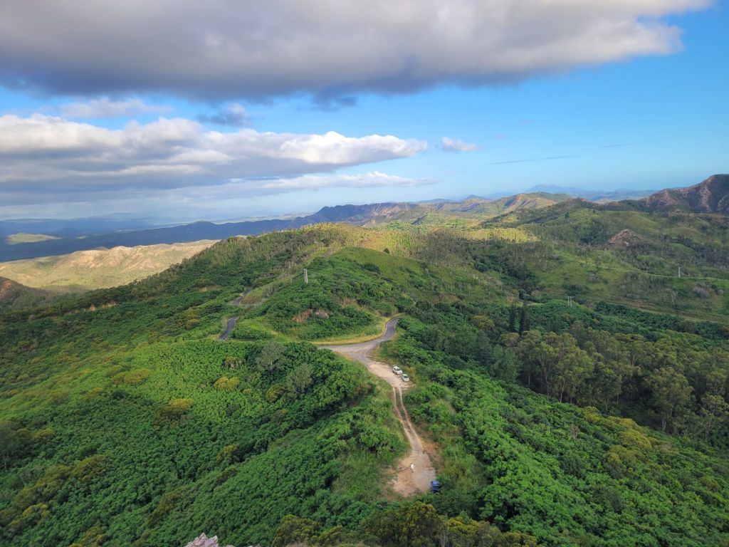 Petite halte avec les copains Thomas et Marie à la Table du Banian, très bon repas, avec une super vue, malgré les nuages, sur une mer d’arbres. Malgré l’annulation de notre vol en ULM, on pourra dire qu’on l’a vu le cœur de Voh. Pas d’aussi haut que souhaité, pas aussi joli que celui de Yann Artus-Bertrand mais il est là ! Et toi, tu le vois ?La photo d’équipe entre 2 averses…Sur la descente, un bel Autour à ventre blanc, à quelques mètres de nous.On a laissé les copains et on est partis faire du camping à Hienghene ! Camping à la calédonienne: pas d’emplacements, tu t’installes où tu veux, pas de frigo, électricité limitée à quelques prises, pas de réseau. Mais pas besoin d’écran le cadre est tellement beau!!