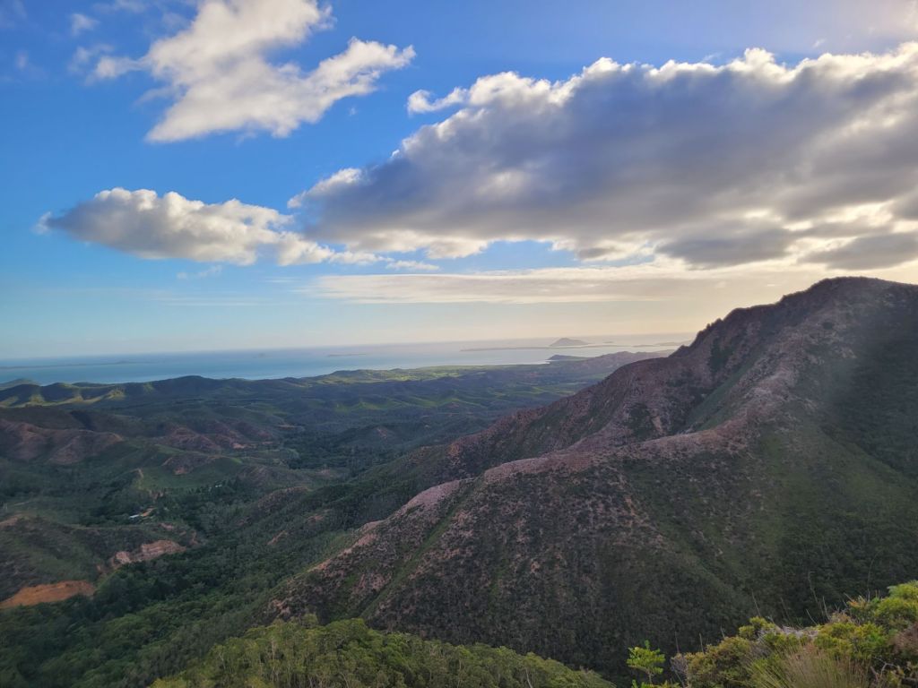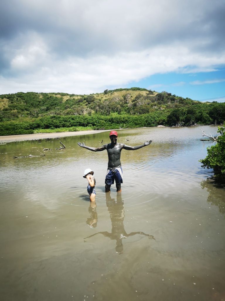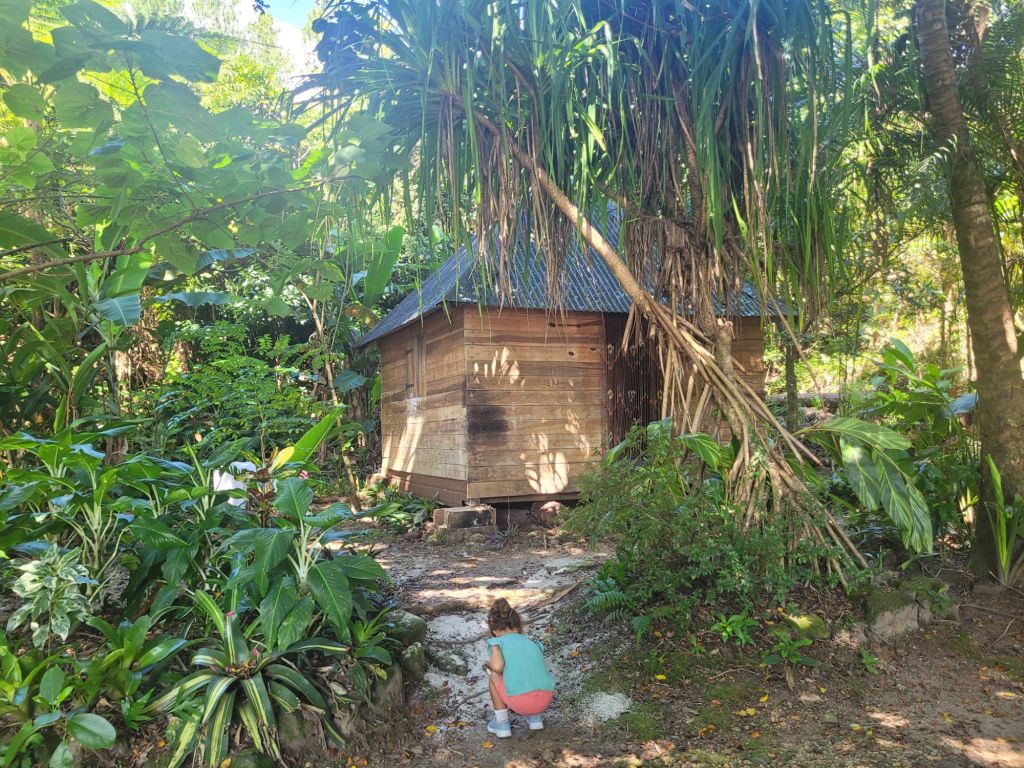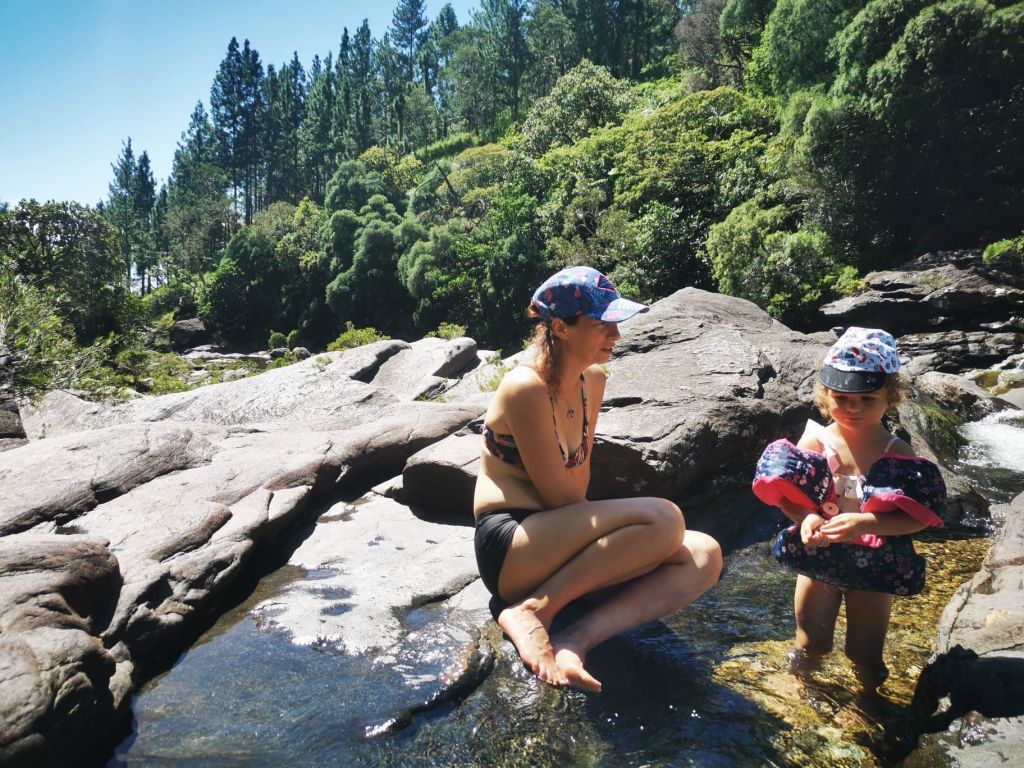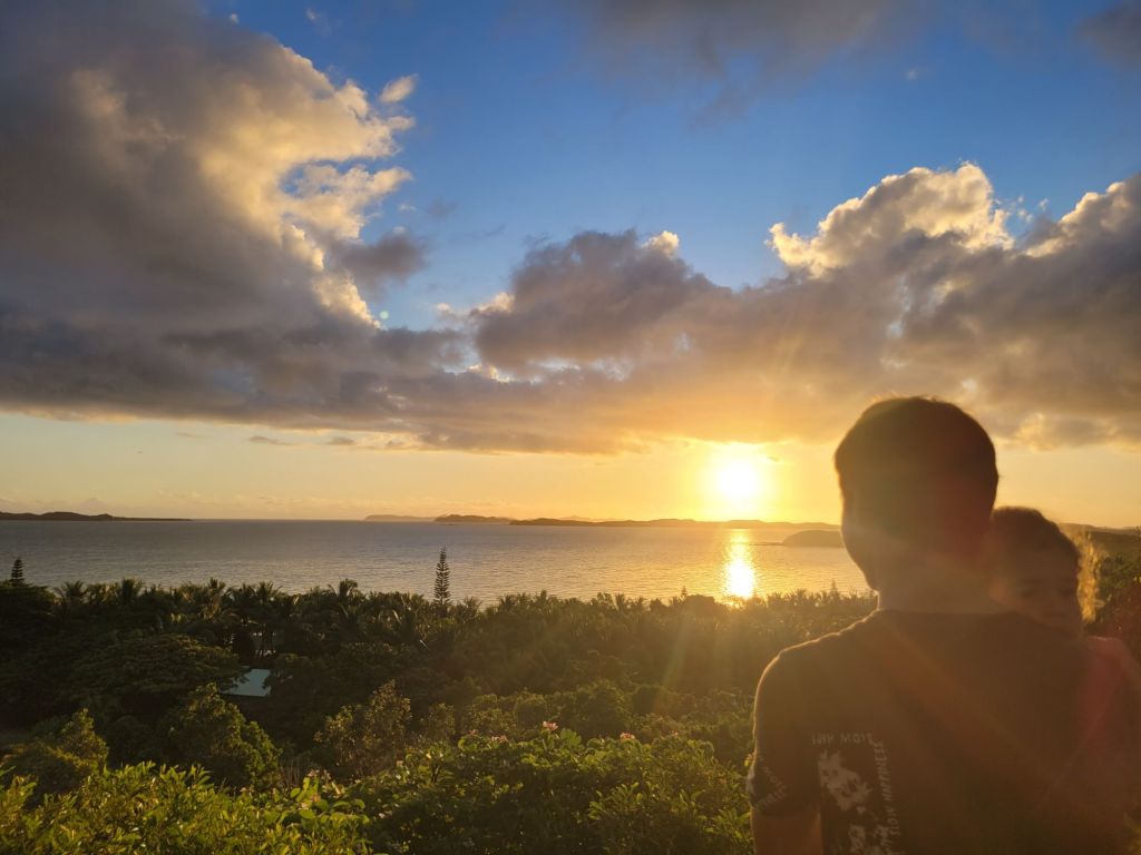 Les roches noires très découpées et la végétation luxuriante offrent un contraste magnifique.Un visiteur… venu d’ailleurs!La fameuse poule qui porte très bien son nom! Et le Sphinx!Petit tour au monument en mémoire de l’embuscade de Waan Yaat. Je vous invite à aller écouter l’émission d’Affaires sensibles sur ce petit bout d’histoire de la Nouvelle-Calédonie. C’est extrêmement intéressant et ça explique beaucoup de choses…Pendant que papa plonge…Vu à la sortie du baptême de Colin.Arrivée de nuit à la Ouane Batch. Accueillis par une grande tablée de 25 convives qui favorise les rencontres et les échanges. Des plats tous plus appétissants les uns que les autres. Une des meilleures tables de NC, assurément!Notre cabane pour deux nuits, rudimentaire mais efficace ! Le bruit des vagues, le vent dans les arbres, le chant des oiseaux… parfait !Baignade à la cascade de ColnettPlein de petits cailloux, de cheminements et de trous d’eau. Un super endroit pour se rafraîchir, pique-niquer, se ressourcer…Et plein de crevettes de creeks qui chatouillent les pieds !Montée rapide au col d’Arama, pendant que Faustine hurle en bas avec son Papa… Pour admirer le super point de vueGrandiose de tout les côtés…Avec un début de soleil couchant…Le lendemain, lever les pieds dans le sable au bungalow de Kejaon. On est à la pointe Nord de Grande-Terre.Le lieu est très chouette, avec un point de vu sur la baie Banare…Un petit étang plein de nénuphars dont les chevaux, en liberté dans le lieu, raffolent.On peut aussi y faire du Canoë…Et essai de paddle compliqué… mais ludique.On en a profité pour aller encore plus au nord. Après un passage par les marais salants de Kô qu’on dirait abandonnés, on part se badigeonner…De boue!!…Puis séchage et pré-rinçage dans la mer… la fin du rinçage se fait avec une eau dans laquelle à infusé diverses plantes, notamment de l’eucalyptus. Très relaxant!Merci la tribu de Kô !En rentrant des bains, on a croisé des chevaux sauvages qui se baignent dans la mer.On a aussi profité quelques nuits d’un super ciel étoilé…